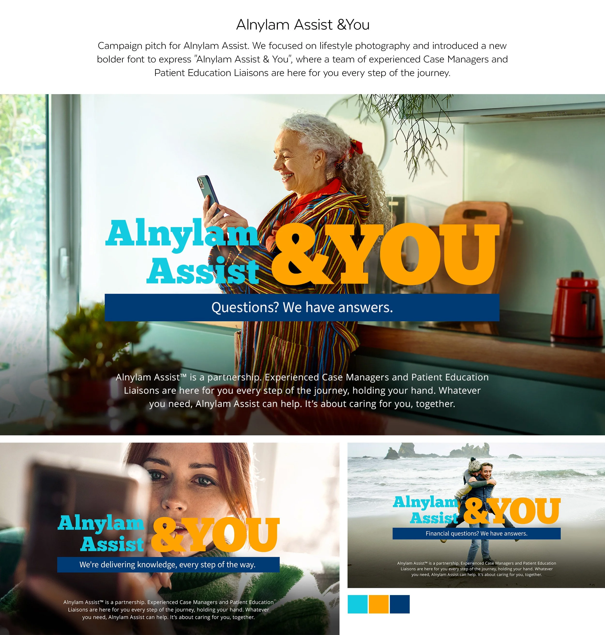 Alnilam is a bright star in the center of Orion's Belt used by navigators. Alnylam symbolizes discovery. Alnylam Pharmaceuticals uses RNAi to "silence" specific genes that cause diseases. They have four products in the US: Onpattro, Givlaari, Oxlumo, & Amvuttra. I worked on the following projects: Alnylam Assist website, Alnylam's corporate website, Oxlumo patient & HCP side of the website and print material, and animated banners for Givlaari with the international team.